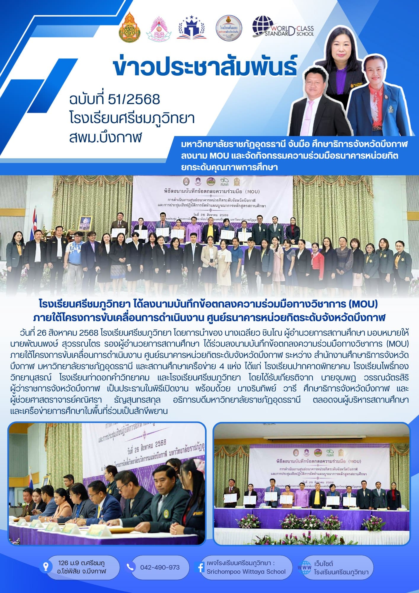 วันที่ 26 สิงหาคม 2568 โรงเรียนศรีชมภูวิทยา โดยการนำของ นางเฉลียว ชินโณ ผู้อำนวยการสถานศึกษา มอบหมายให้ นายพัฒนพงษ์ สุวรรณโตร รองผู้อำนวยการสถานศึกษา ได้ร่วมลงนามบันทึกข้อตกลงความร่วมมือทางวิชาการ (MOU) ภายใต้โครงการขับเคลื่อนการดำเนินงาน ศูนย์ธนาคารหน่วยกิตระดับจังหวัดบึงกาฬ ระหว่าง สำนักงานศึกษาธิการจังหวัด บึงกาฬ มหาวิทยาลัยราชภัฏอุดรรานี และสถานศึกษาเครือข่าย 4 แห่ง ได้แก่ โรงเรียนปากคาดพิทยาคม โรงเรียนโพธิ์ทองวิทยานุสรณ์ โรงเรียนท่าดอกคำวิทยาคม และโรงเรียนศรีชมภูวิทยา โดยได้รับเกียรติจาก นายจุมพฏ วรรณฉัตรสิริ ผู้ว่าราชการจังหวัดบึงกาฬ เป็นประธานในพิธีเปิดงาน พร้อมด้วย นางรินทิพย์ วารี ศึกษาธิการจังหวัดบึงกาฬ และ ผู้ช่วยศาสตราจารย์คณิศรา รัญสุนทรสกุล อธิการบดีมหาวิทยาลัยราชภัฏอุดรรานี ตลอดจนผู้บริหารสถานศึกษา และเครือข่ายการศึกษาในพื้นที่ร่วมเป็นสักขีพยาน |