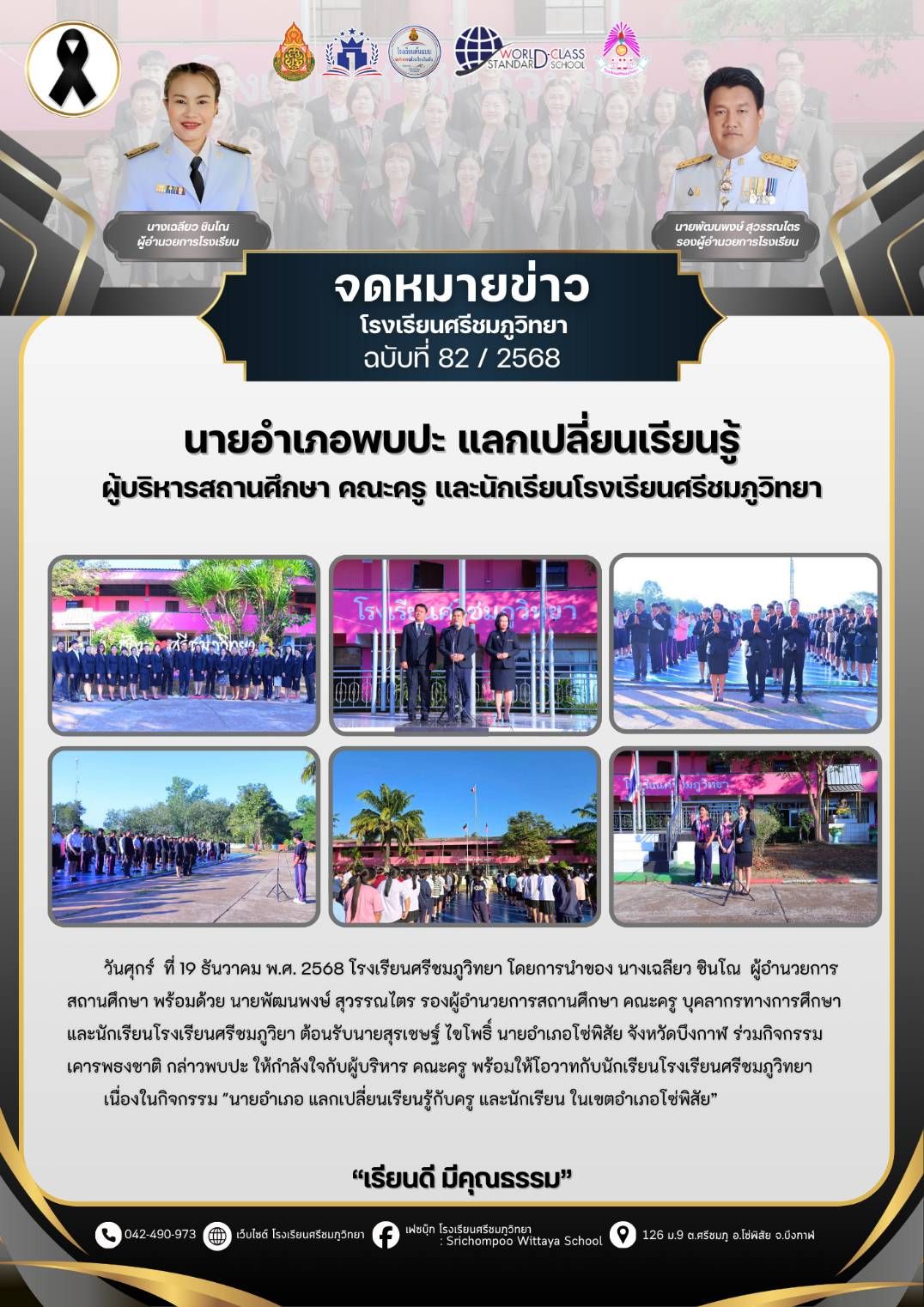 วันศุกร์ ที่ 19 ธันวาคม พ.ศ. 2568 โรงเรียนศรีชมภูวิทยา โดยการนำของ นางเฉลียว ชินโณ ผู้อำนวยการสถานศึกษา พร้อมด้วย นายพัฒนพงษ์ สุวรรณไตร รองผู้อำนวยการสถานศึกษา คณะครู บุคลากรทางการศึกษา และนักเรียนโรงเรียนศรีชมภูวิยา ต้อนรับนายสุรเชษฐ์ ไขโพธิ์ นายอำเภอโซ่พิสัย จังหวัดบึงกาฬ ร่วมกิจกรรมเคารพธงชาติ กล่าวพบปะ ให้กำลังใจกับผู้บริหาร คณะครู พร้อมให้โอวาทกับนักเรียนโรงเรียนศรีชมภูวิทยา