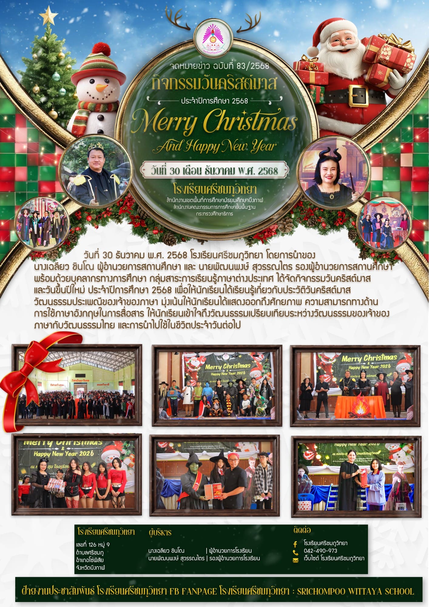 วันที่ 30 ธันวาคม พ.ศ.2568 โรงเรียนศรีชมภูวิทยา โดยการนำของนางเฉลียว ชินโณ ผู้อำนวยการสถานศึกษา และนายพัฒนพงษ์ สุวรรณไตร รองผู้อำนวยการสถานศึกษา พร้อมด้วยบุคลากรทางการศึกษา กลุ่มสาระการเรียนรู้ภาษาต่างประเทศ ได้จัดกิจกรรมวันคริสต์มาส และวันขึ้นปีใหม่ ประจำปีการศึกษา 2568 เพื่อให้นักเรียนได้เรียนรู้เกี่ยวกับประวัติวันคริสต์มาส วัฒนธรรมประเพณีของเจ้าของภาษา มุ่งเน้นให้นักเรียนได้แสดงออกถึงศักยภาพ ความสามารถทางด้านการใช้ภาษาอังกฤษในการสื่อสาร ให้นักเรียนเข้าใจถึงวัฒนธรรมเปรียบเทียบระหว่างวัฒนธรรมของเจ้าของภาษากับวัฒนธรรมไทย และการนำไปใช้ในชีวิตประจำวันต่อไป |