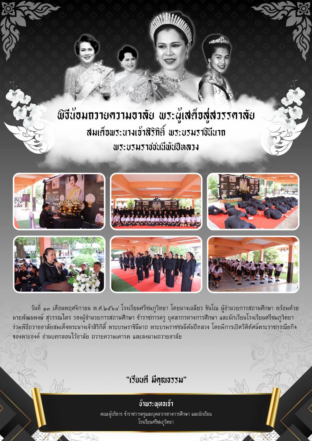 วันที่ ๑๓ เดือนพฤศจิกายน พ.ศ.๒๕๖๘ โรงเรียนศรีชมภูวิทยา โดยนางเฉลียว ชินโณ ผู้อำนวยการสถานศึกษา พร้อมด้วยนายพัฒนพงษ์ สุวรรณไตร รองผู้อำนวยการสถานศึกษา ข้าราชการครู บุคลากรทางการศึกษา และนักเรียนโรงเรียนศรีชมภูวิทยา ร่วมพิธีถวายอาลัยสมเด็จพระนางเจ้าสิริกิติ์ พระบรมราชินีนาถ พระบรมราชชนนีพันปีหลวง โดยมีการจัดนิทรรศการพระราชประวัติ