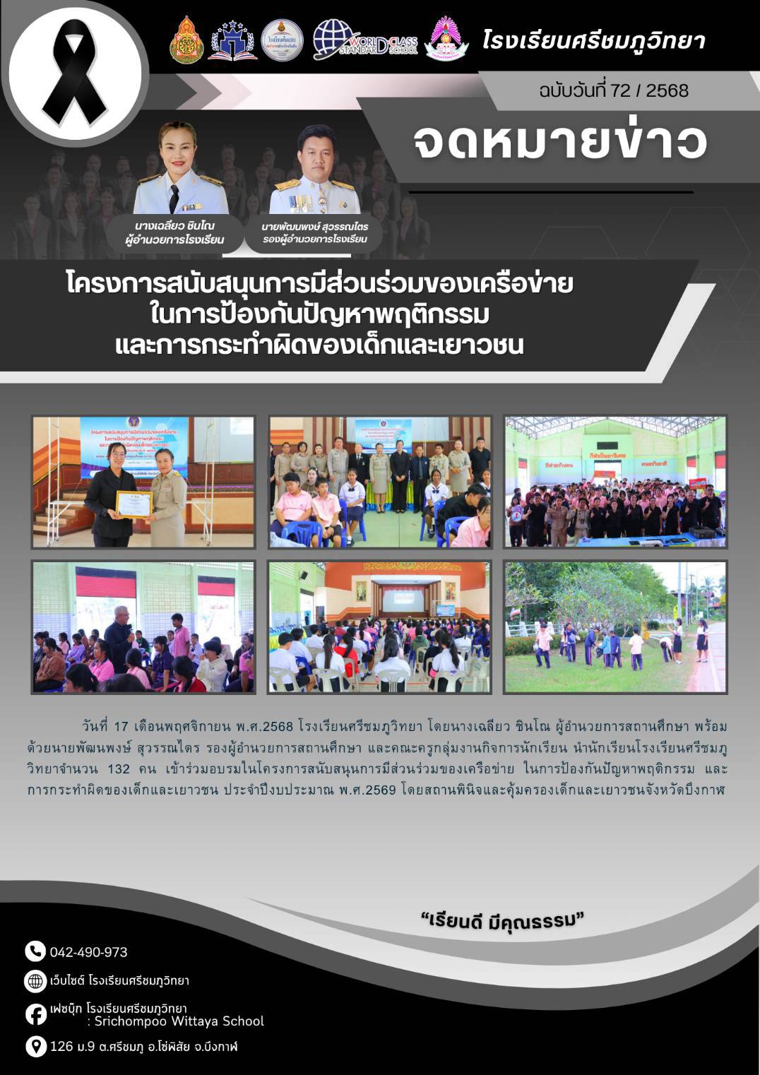 วันที่ 17 เดือนพฤศจิกายน พ.ศ.2568 โรงเรียนศรีชมภูวิทยา โดยนางเฉลียว ชินโณ ผู้อำนวยการสถานศึกษา พร้อมด้วยนายพัฒนพงษ์ สุวรรณไตร รองผู้อำนวยการสถานศึกษา และคณะครูกลุ่มงานกิจการนักเรียน นำนักเรียนโรงเรียนศรีชมภูวิทยาจำนวน 132 คน เข้าร่วมอบรมในโครงการสนับสนุนการมีส่วนร่วมของเครือข่าย ในการป้องกันปัญหาพฤติกรรม และการกระทำผิดของเด็กและเยาวชน ประจำปีงบประมาณ พ.ศ.2569 โดยสถานพินิจและคุ้มครองเด็กและเยาวชนจังหวัดบึงกาฬ |