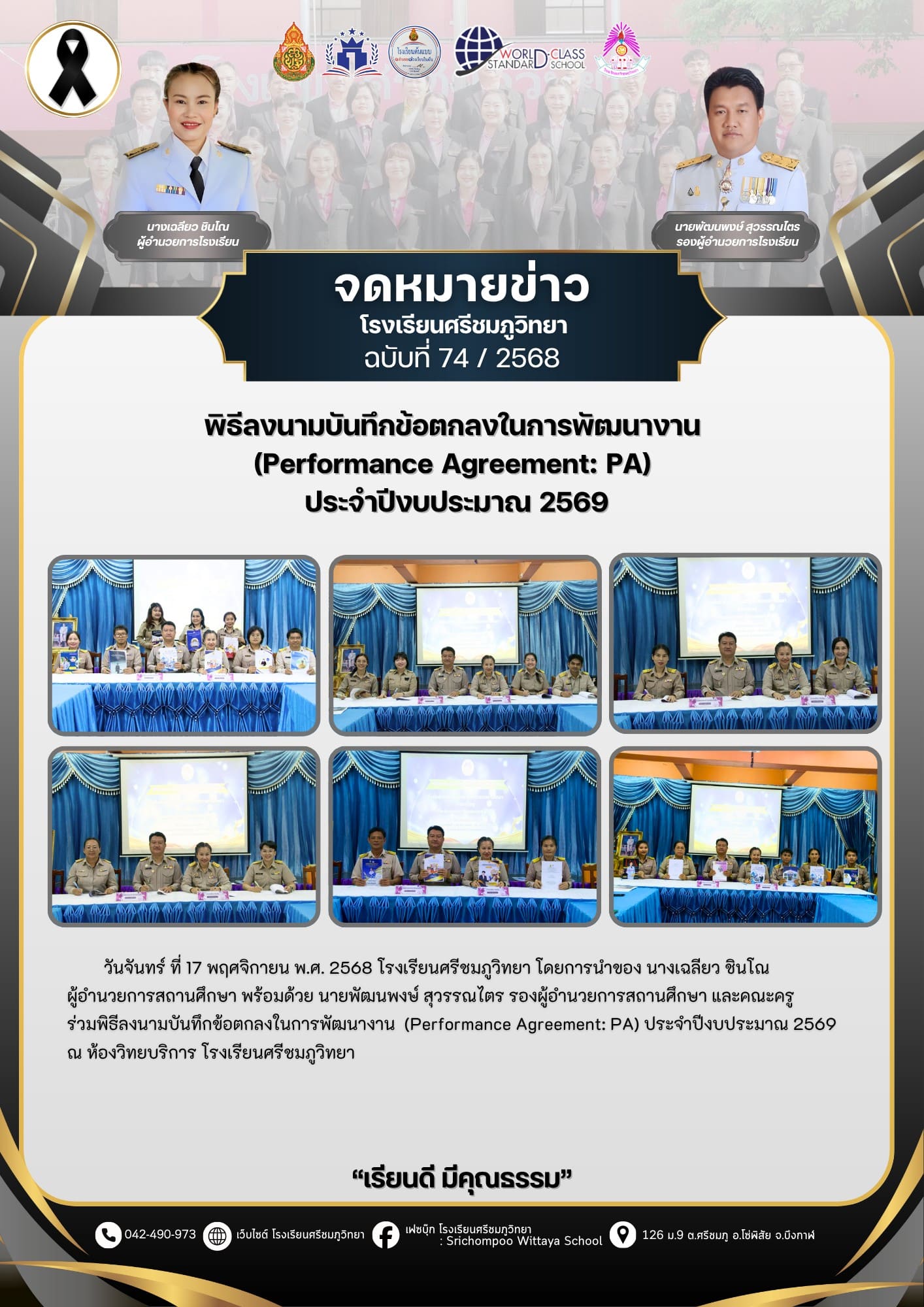 ร่วมพิธีลงนามบันทึกข้อตกลงในการพัฒนางาน (Performance Agreement: PA) ประจำปีงบประมาณ 2569 ณ ห้องวิทยบริการ โรงเรียนศรีชมภูวิทยา |