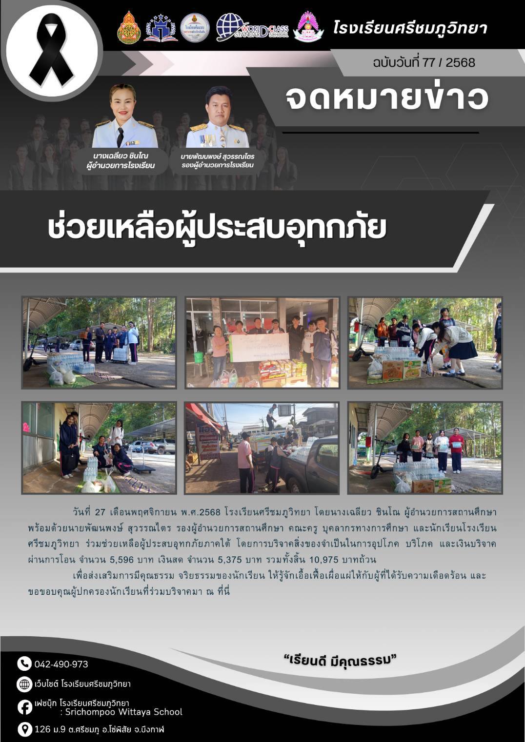 วันที่ 27 เดือนพฤศจิกายน พ.ศ.2568 โรงเรียนศรีชมภูวิทยา โดยนางเฉลียว ชินโณ ผู้อำนวยการสถานศึกษา พร้อมด้วยนายพัฒนพงษ์ สุวรรณไตร รองผู้อำนวยการสถานศึกษา คณะครู บุคลากรทางการศึกษา และนักเรียนโรงเรียนศรีชมภูวิทยา ร่วมช่วยเหลือผู้ประสบอุทกภัยภาคใต้ โดยการบริจาคสิ่งของจำเป็นในการอุปโภค บริโภค และเงินบริจาคผ่านการโอน จำนวน 5,596 บาท เงินสด จำนวน 5,375 บาท รวมทั้งสิ้น 10,975 บาทถ้วน